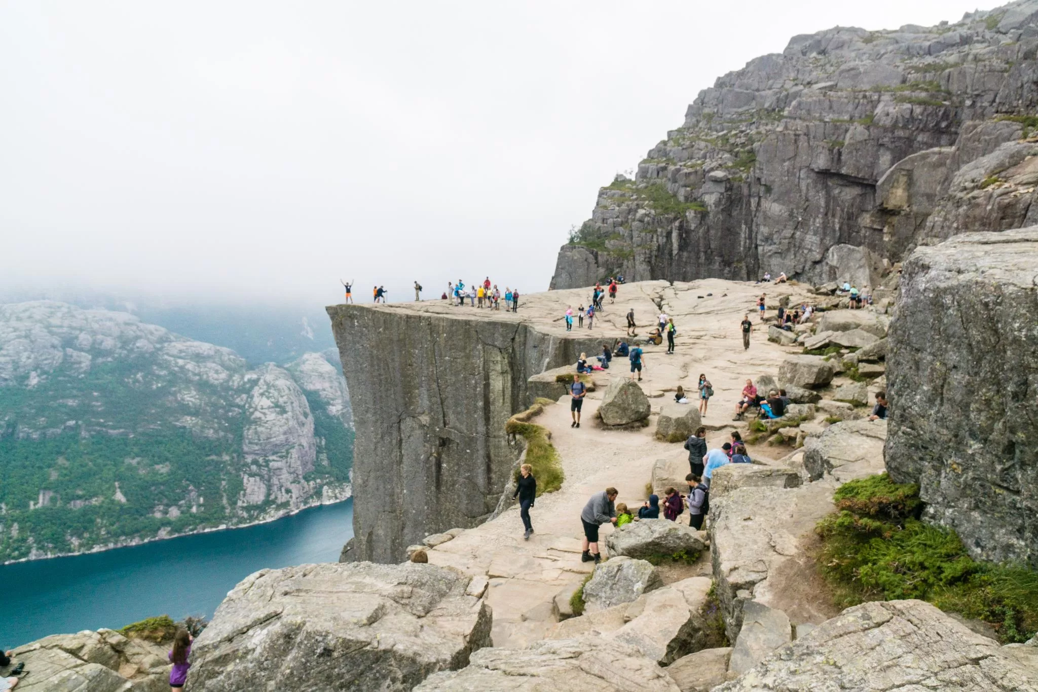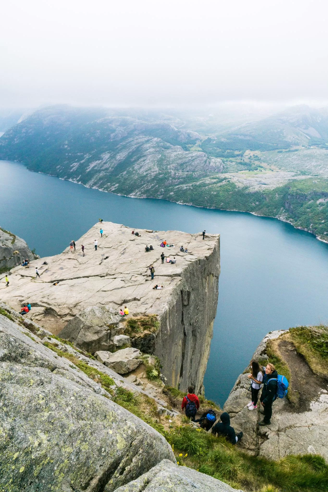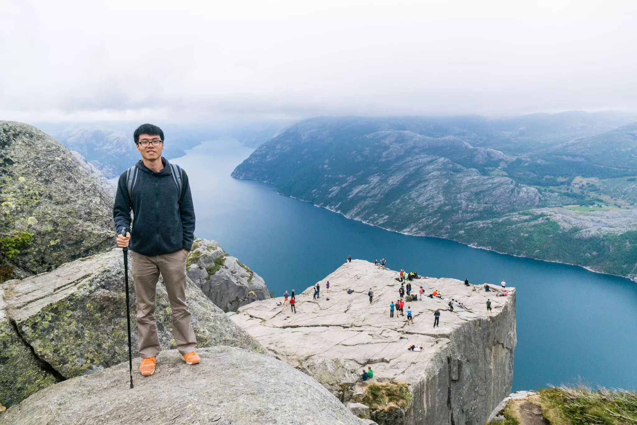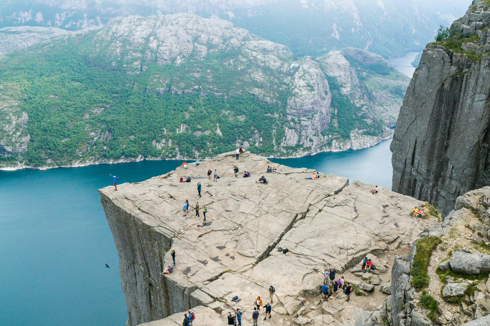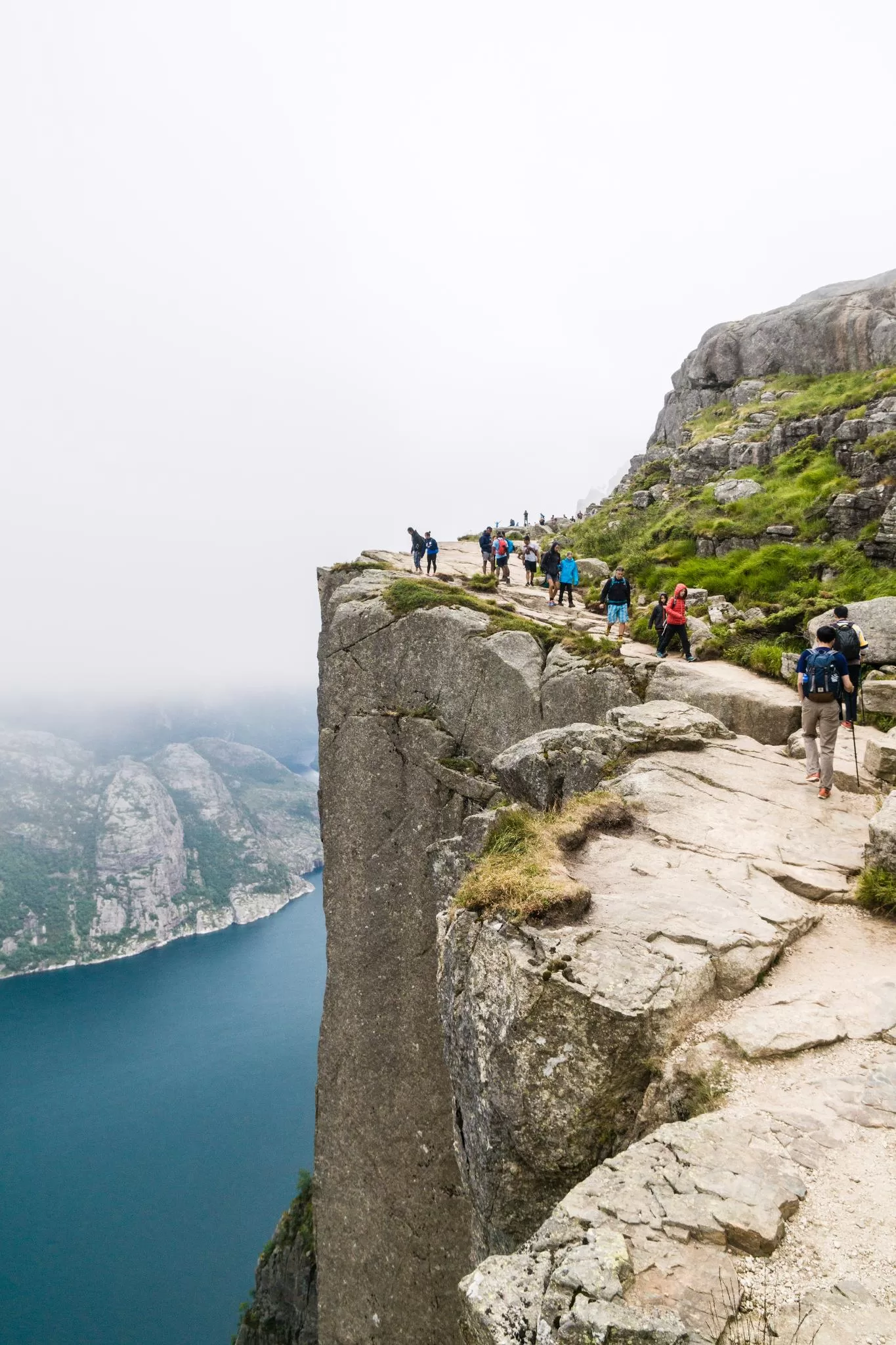 我們到的時候,正值下午時分,此時聖壇岩上起了濃霧,宛如薄紗一般披散在蜿蜒的呂瑟峽灣上,增添了幾分朦朧的美感。雖然無法看清峽灣遼闊的樣貌,卻絲毫不減壯闊峽灣的帶給旅人的震撼。