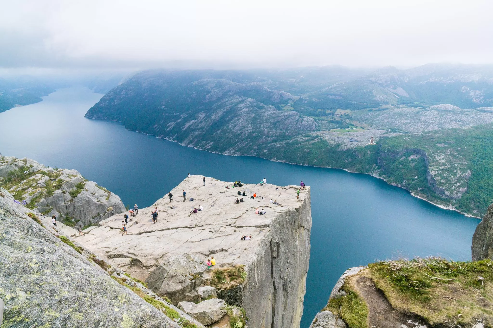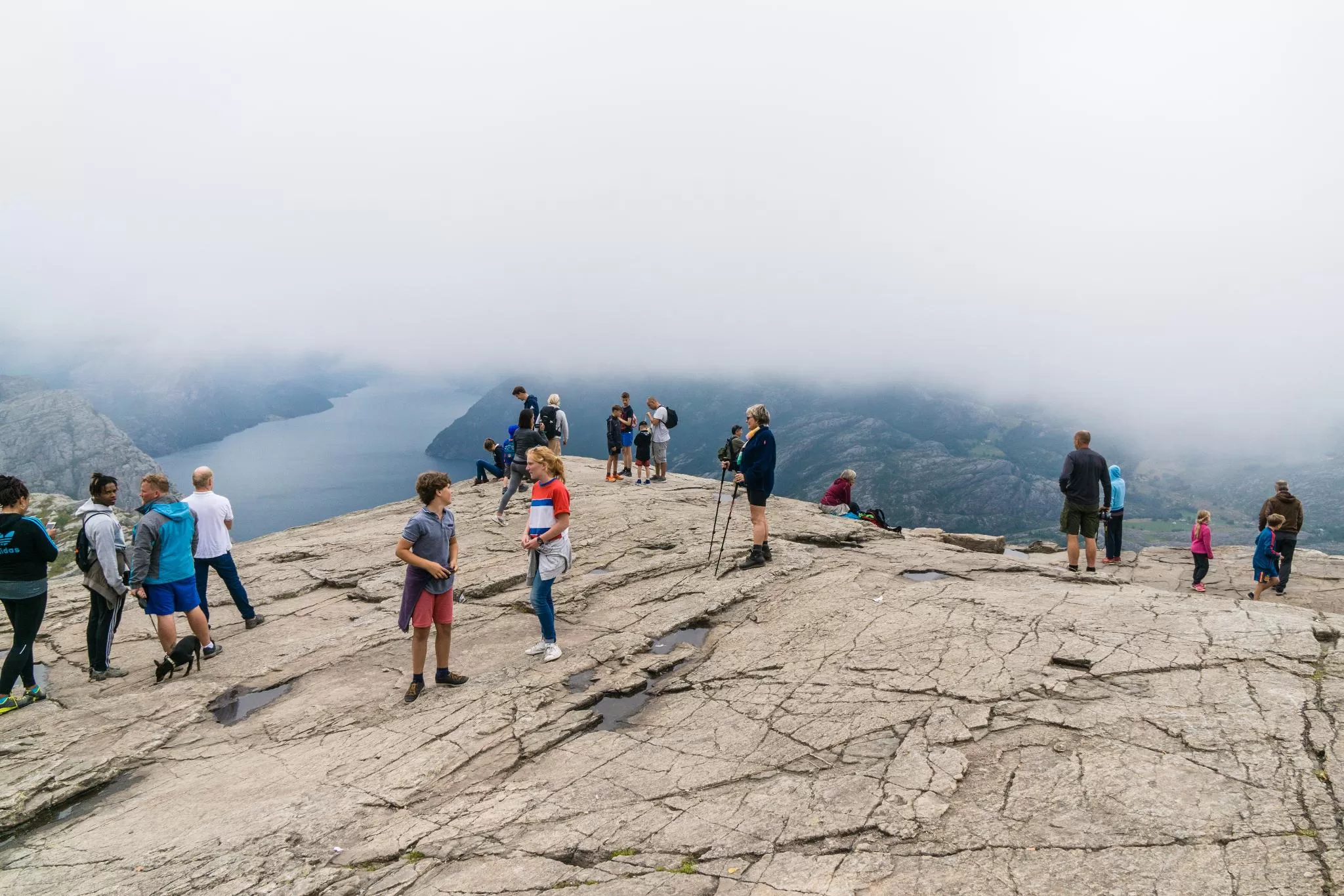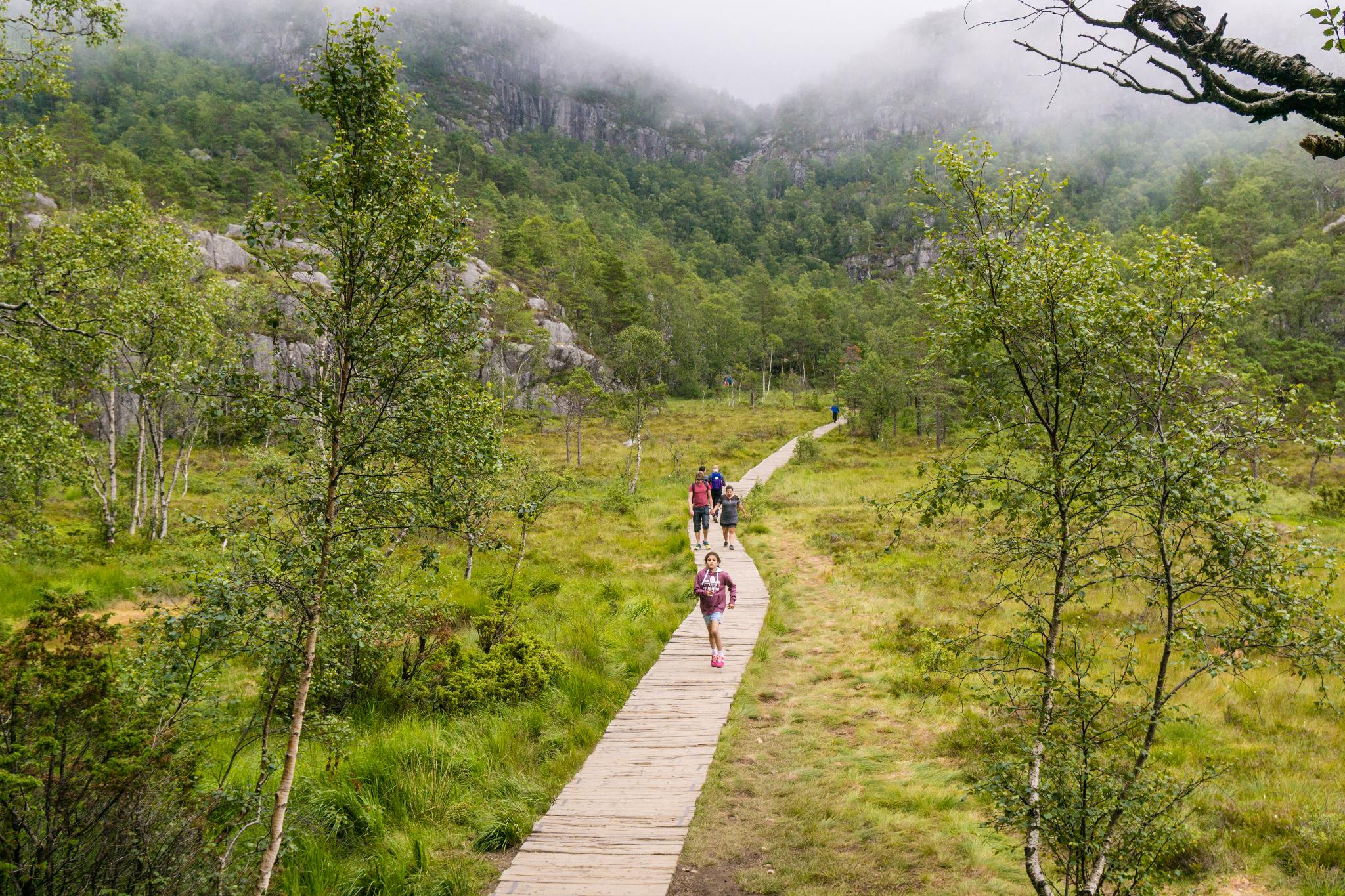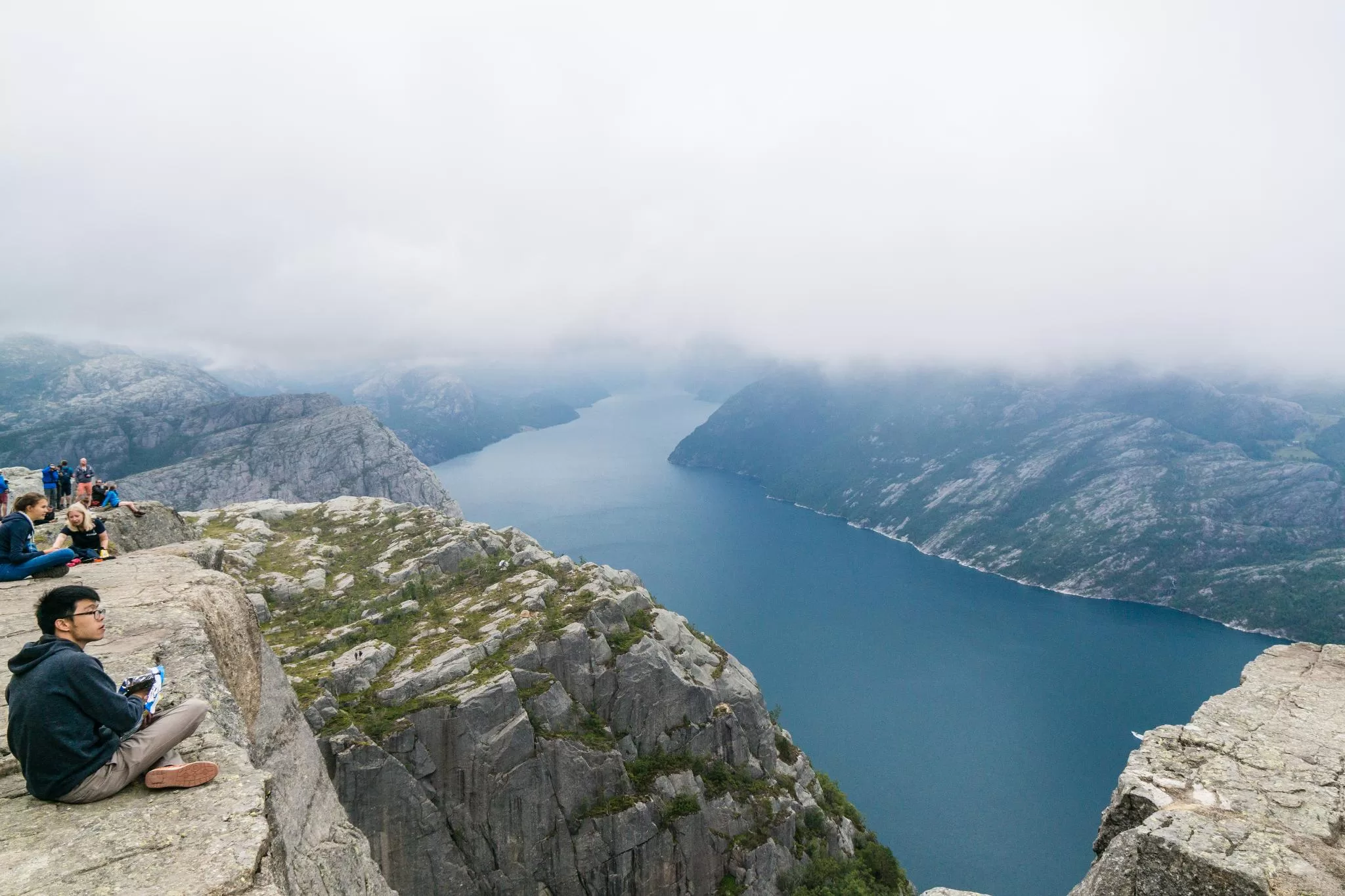我們到的時候,正值下午時分,此時聖壇岩上起了濃霧,宛如薄紗一般披散在蜿蜒的呂瑟峽灣上,增添了幾分朦朧的美感。雖然無法看清峽灣遼闊的樣貌,卻絲毫不減壯闊峽灣的帶給旅人的震撼。