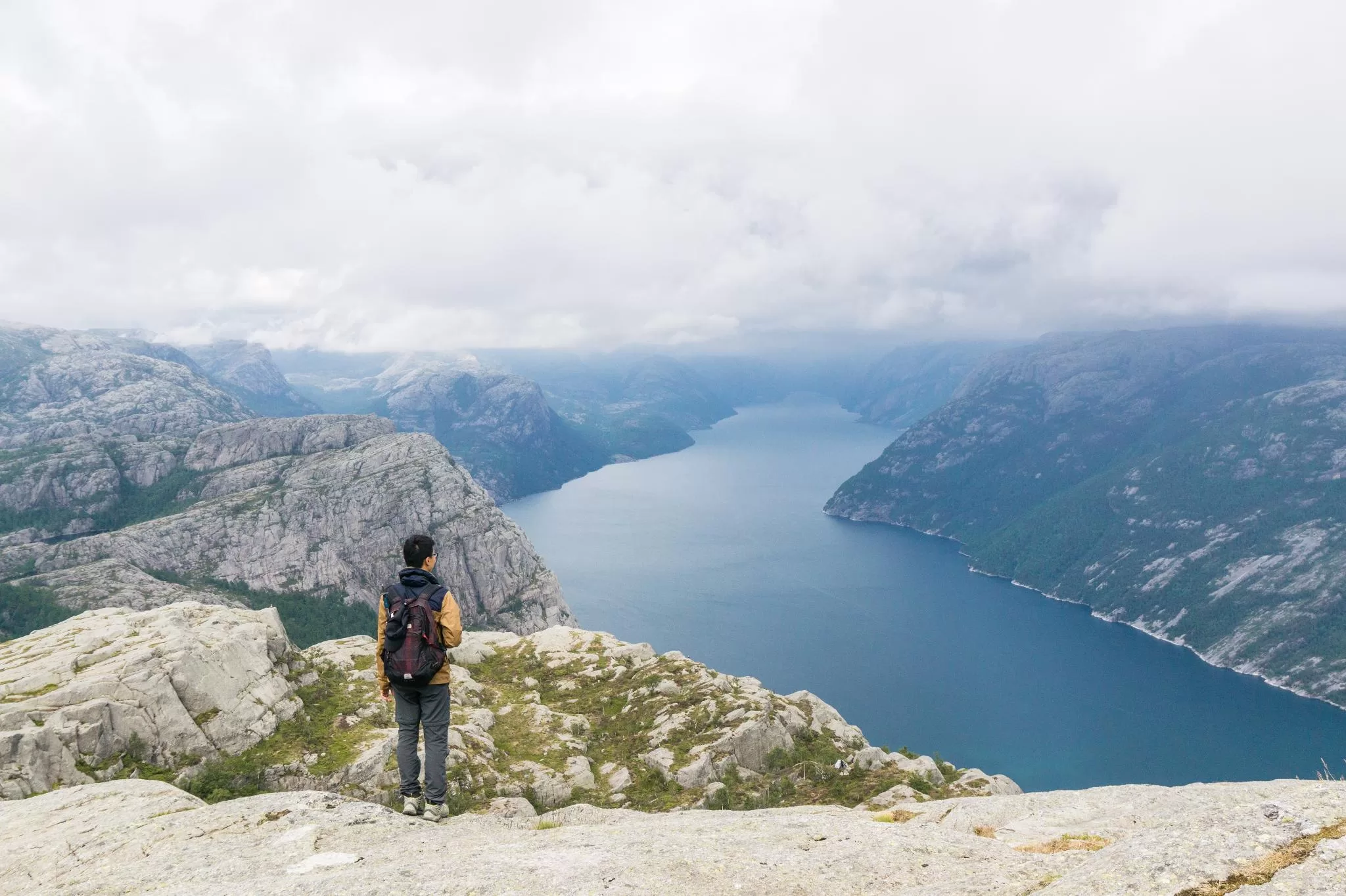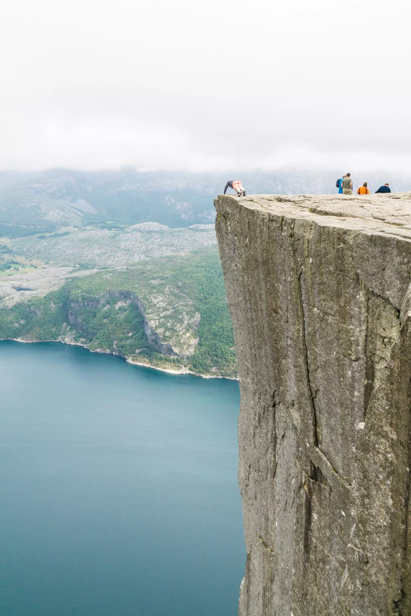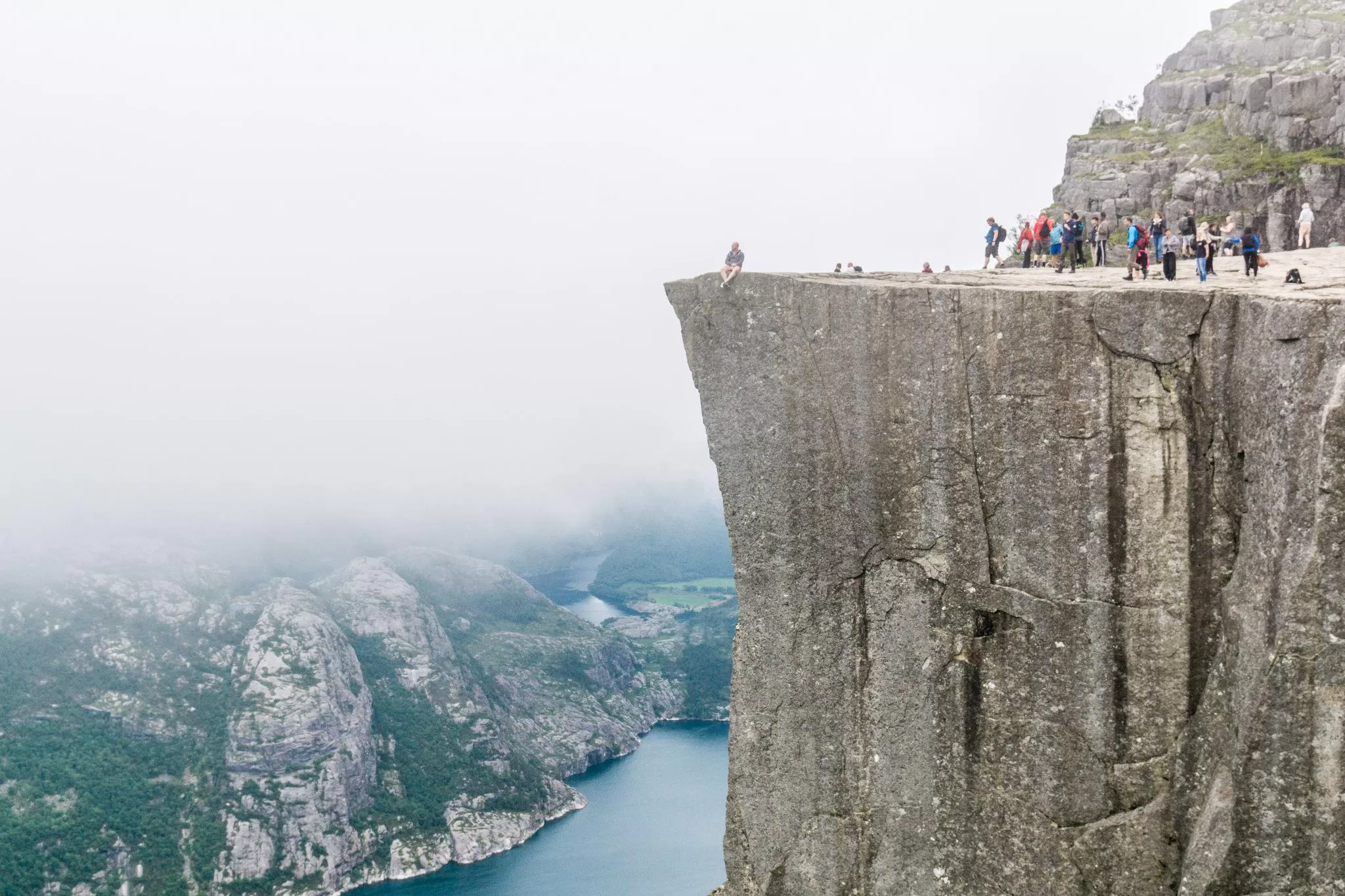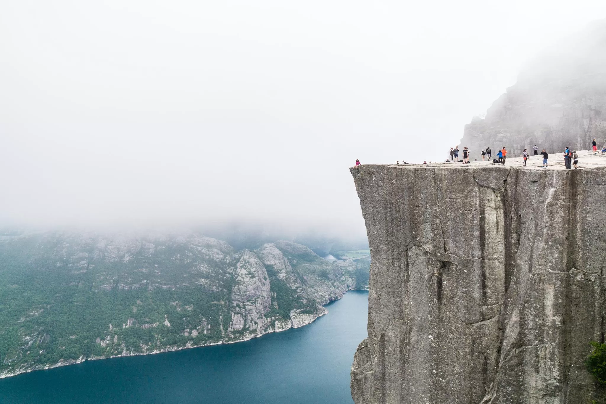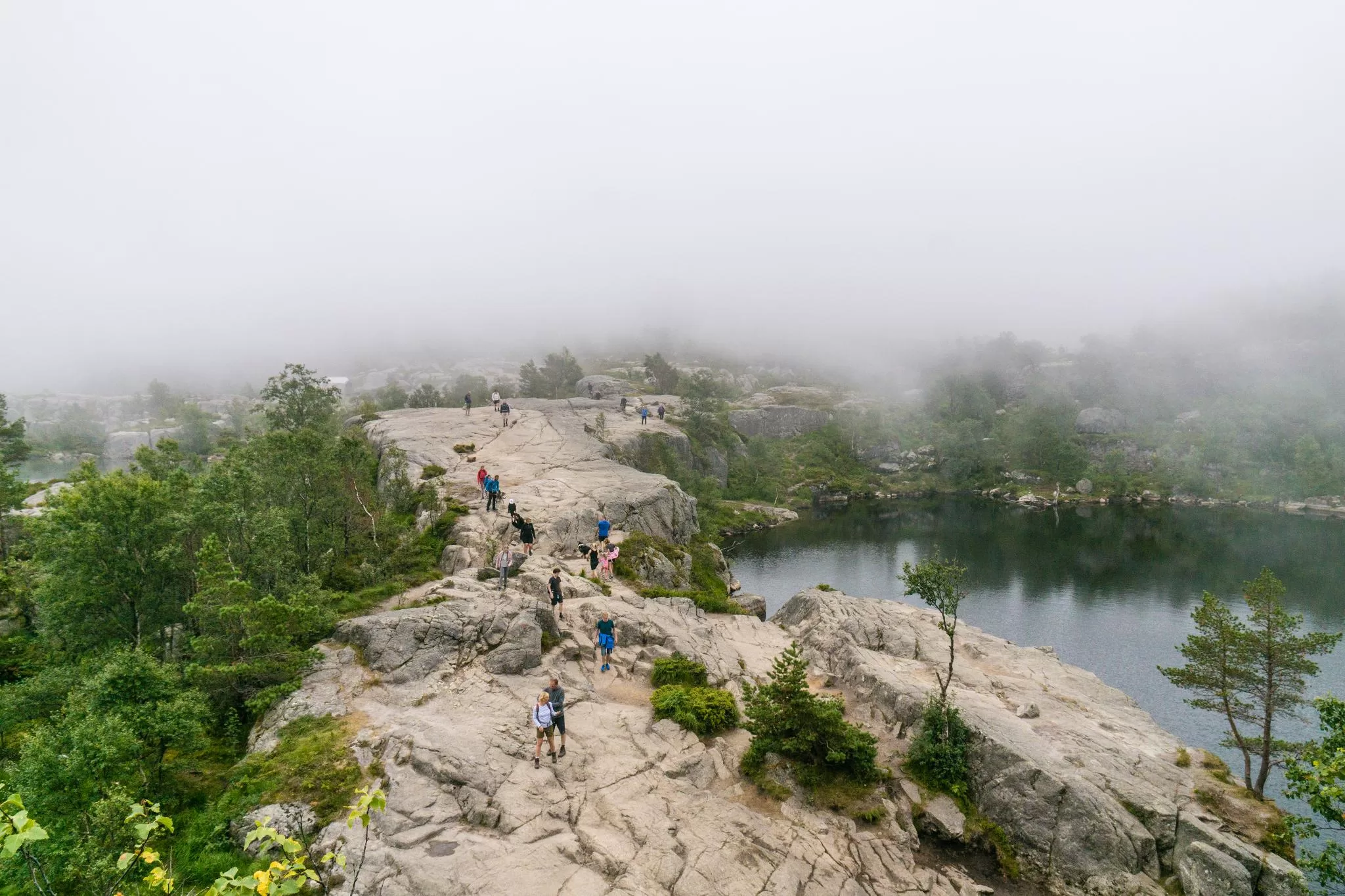 我們到的時候,正值下午時分,此時聖壇岩上起了濃霧,宛如薄紗一般披散在蜿蜒的呂瑟峽灣上,增添了幾分朦朧的美感。雖然無法看清峽灣遼闊的樣貌,卻絲毫不減壯闊峽灣的帶給旅人的震撼。