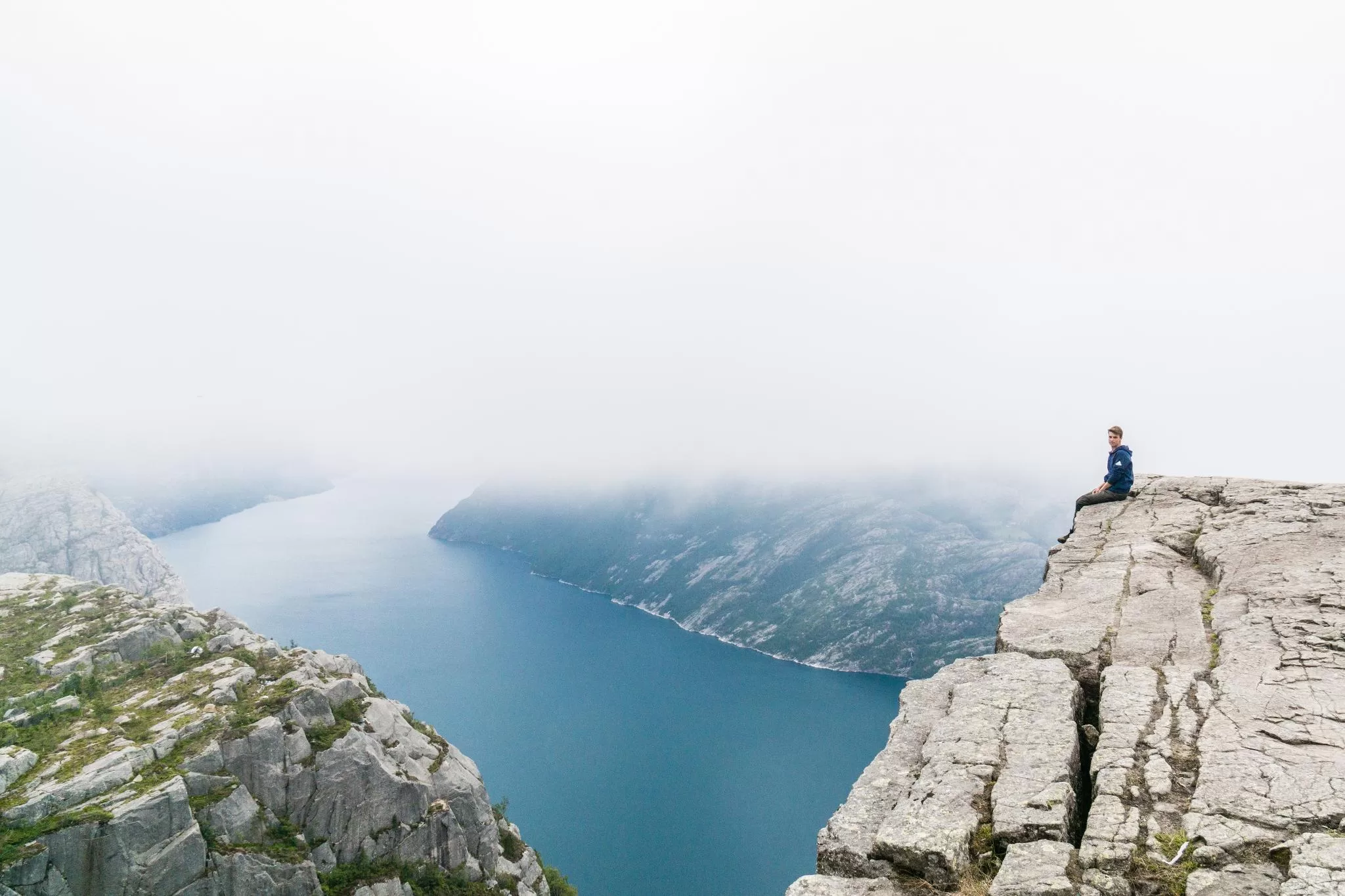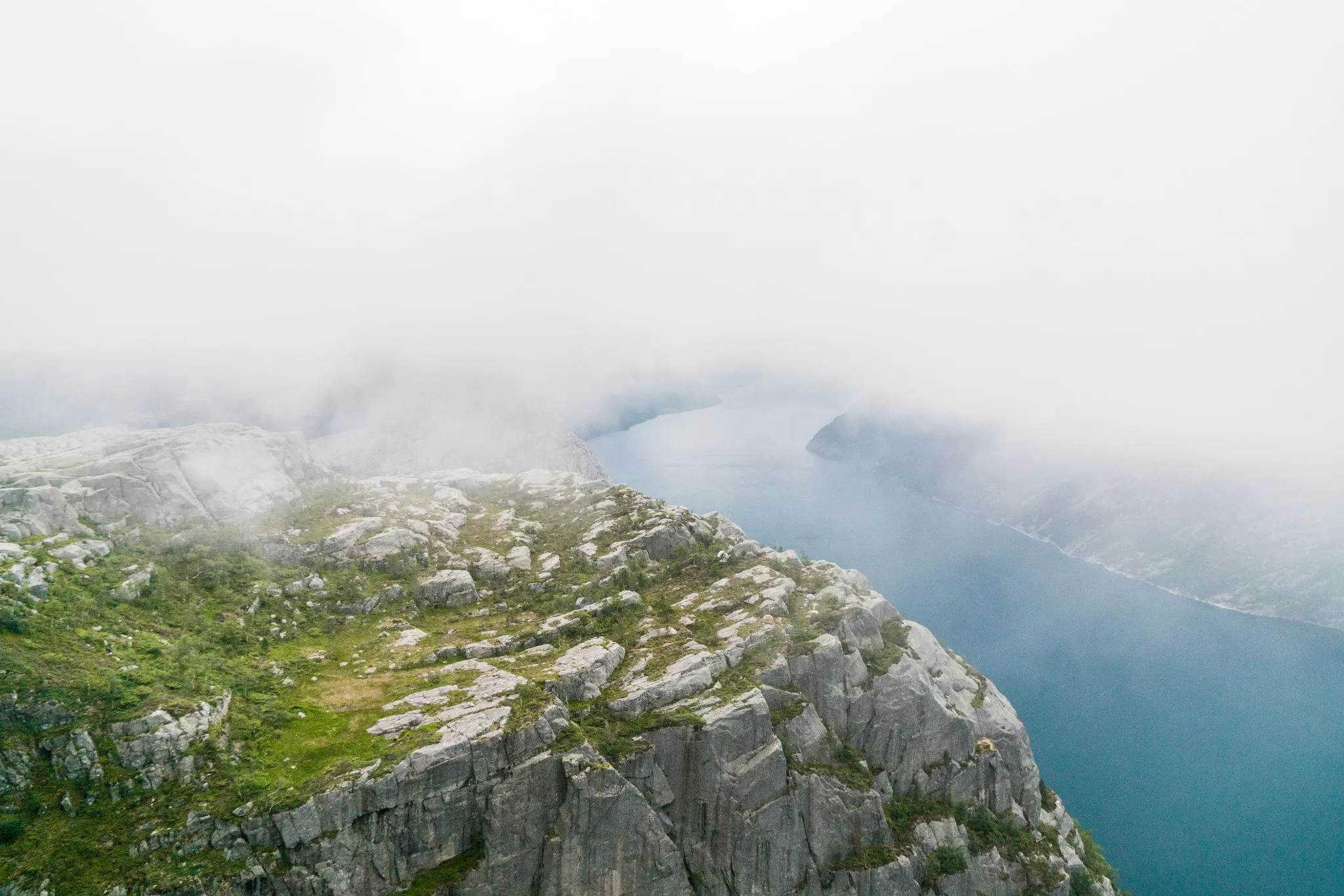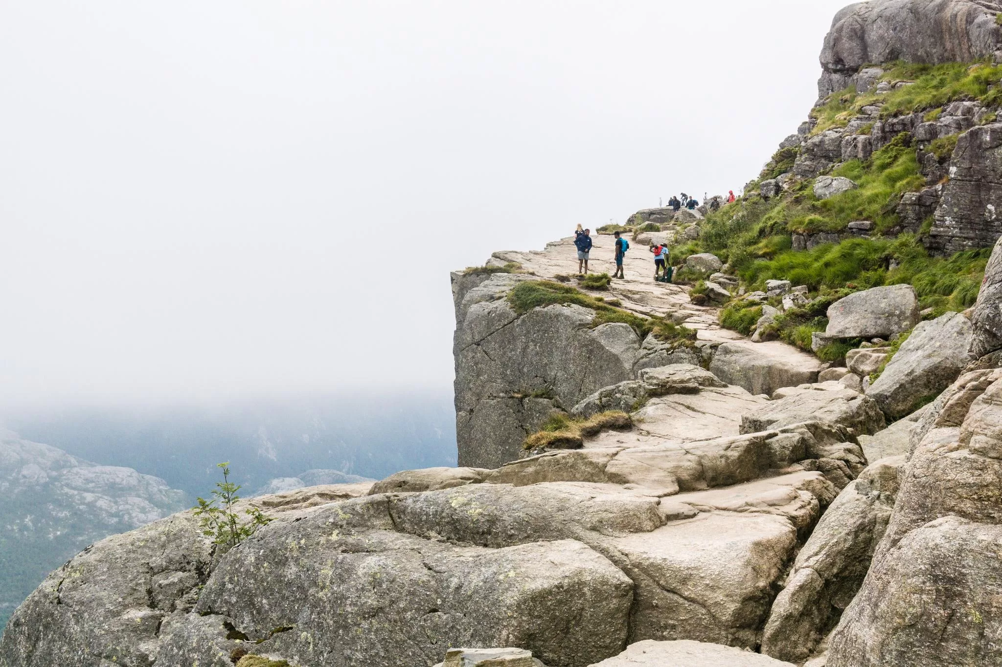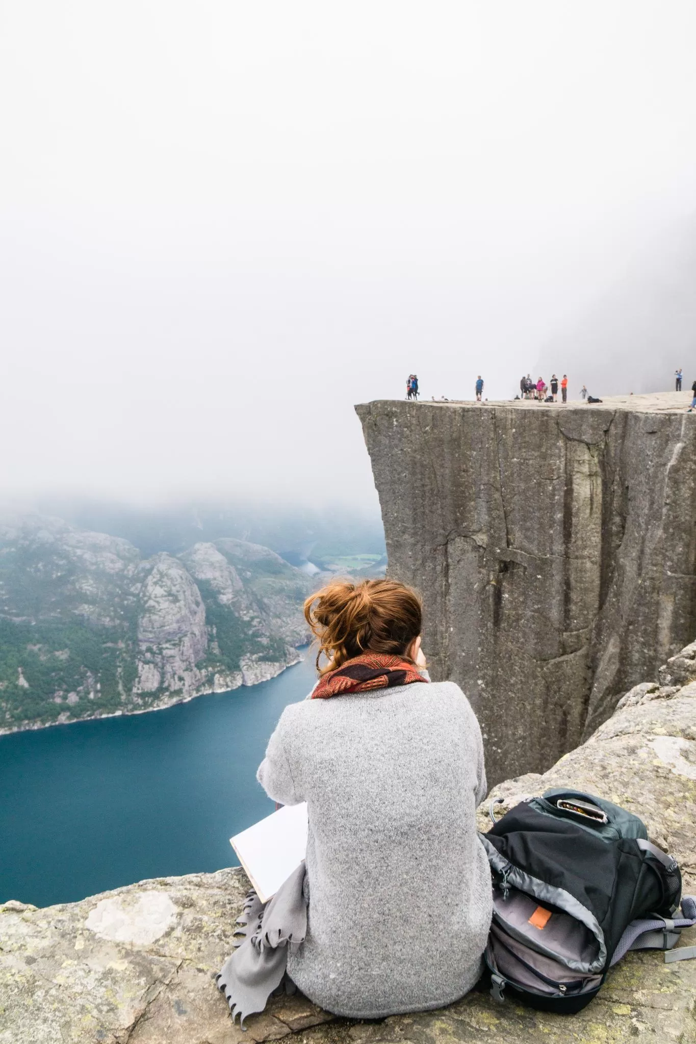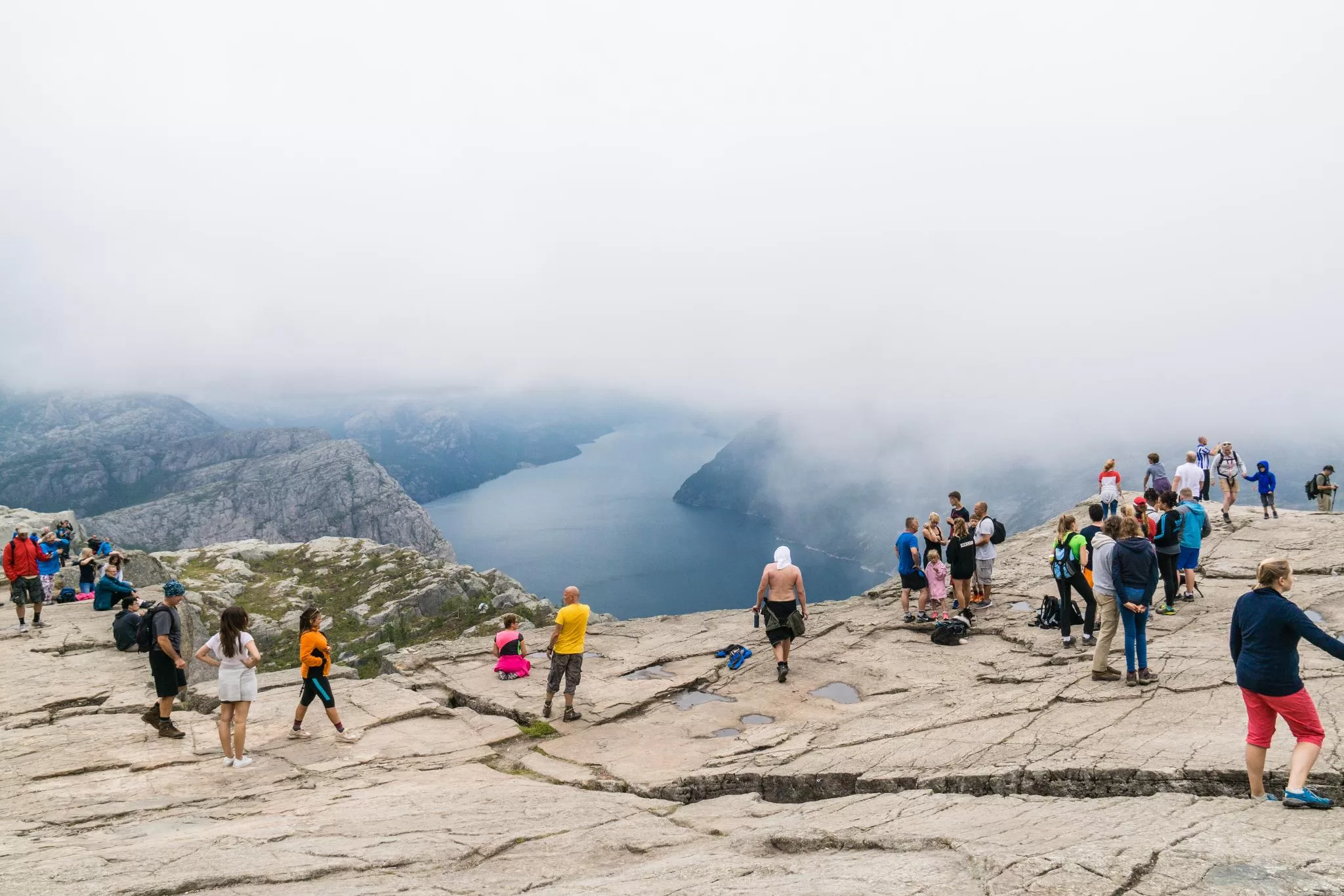 我們到的時候,正值下午時分,此時聖壇岩上起了濃霧,宛如薄紗一般披散在蜿蜒的呂瑟峽灣上,增添了幾分朦朧的美感。雖然無法看清峽灣遼闊的樣貌,卻絲毫不減壯闊峽灣的帶給旅人的震撼。