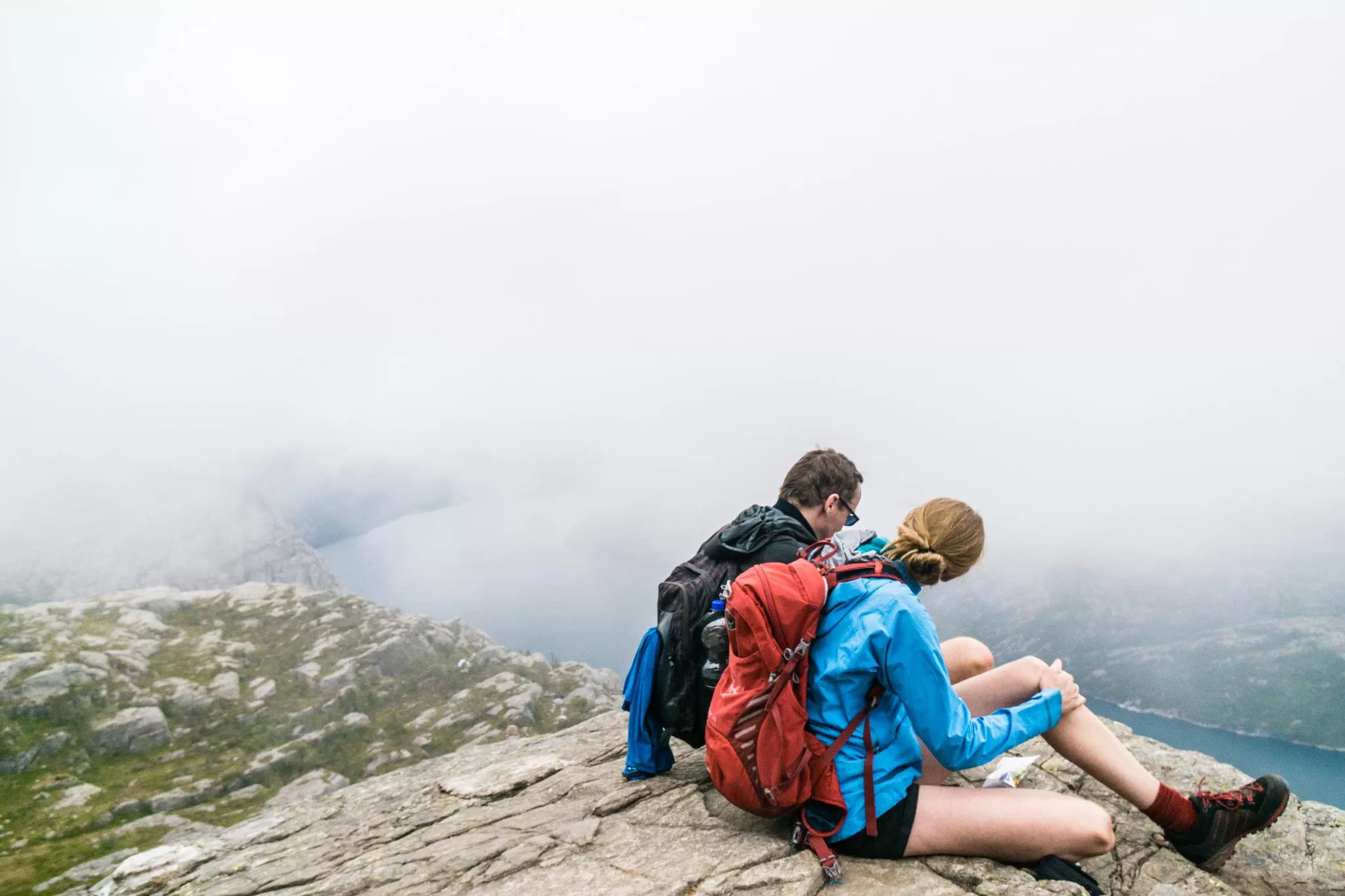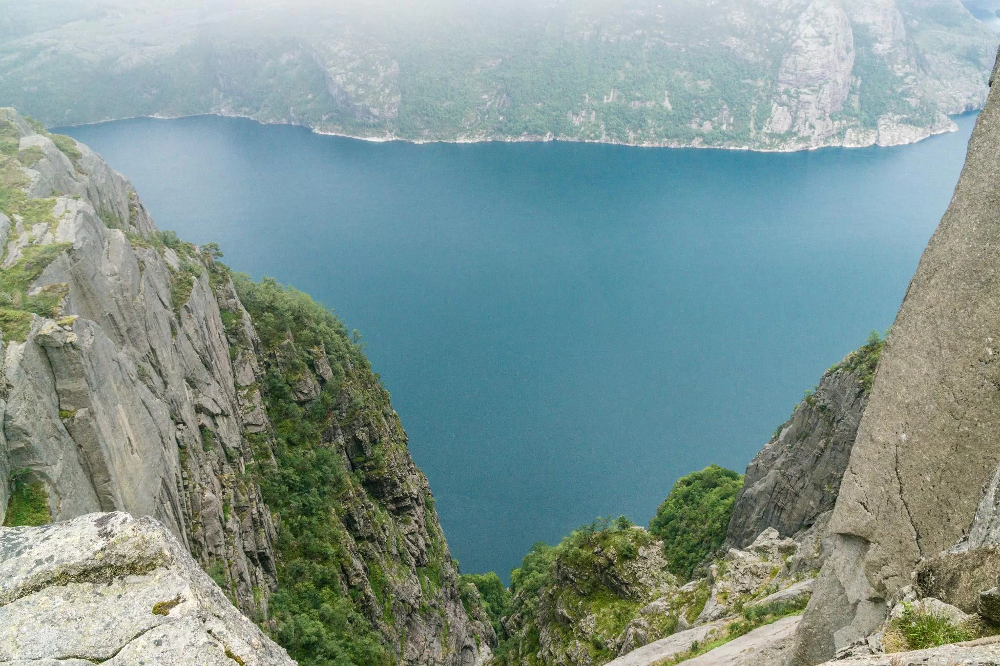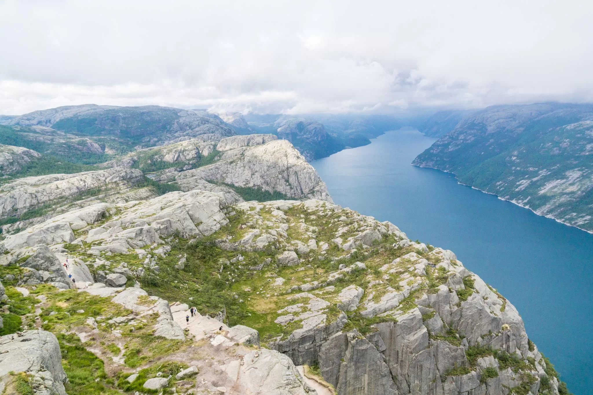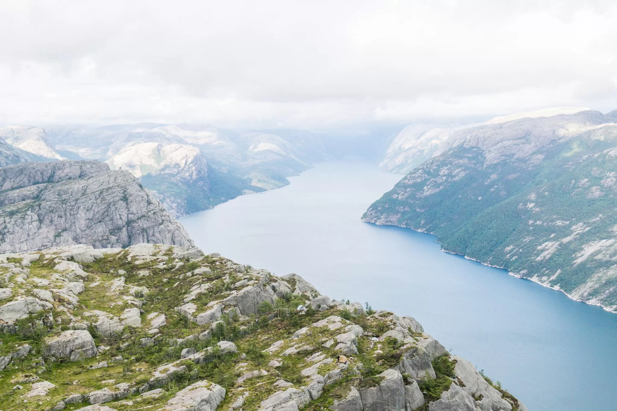 我們到的時候,正值下午時分,此時聖壇岩上起了濃霧,宛如薄紗一般披散在蜿蜒的呂瑟峽灣上,增添了幾分朦朧的美感。雖然無法看清峽灣遼闊的樣貌,卻絲毫不減壯闊峽灣的帶給旅人的震撼。