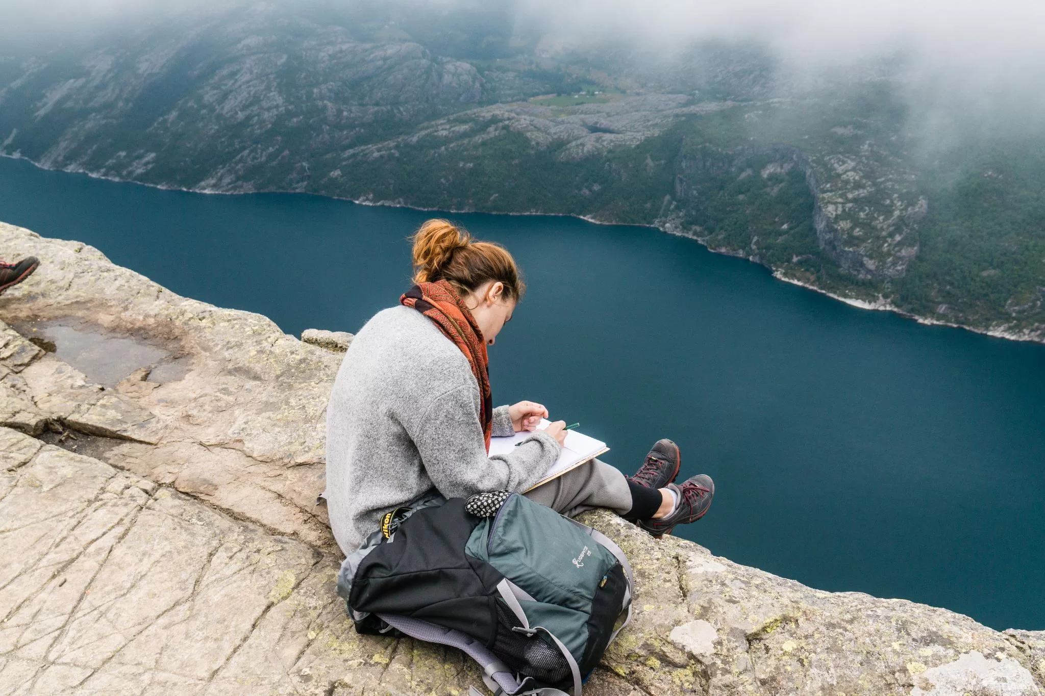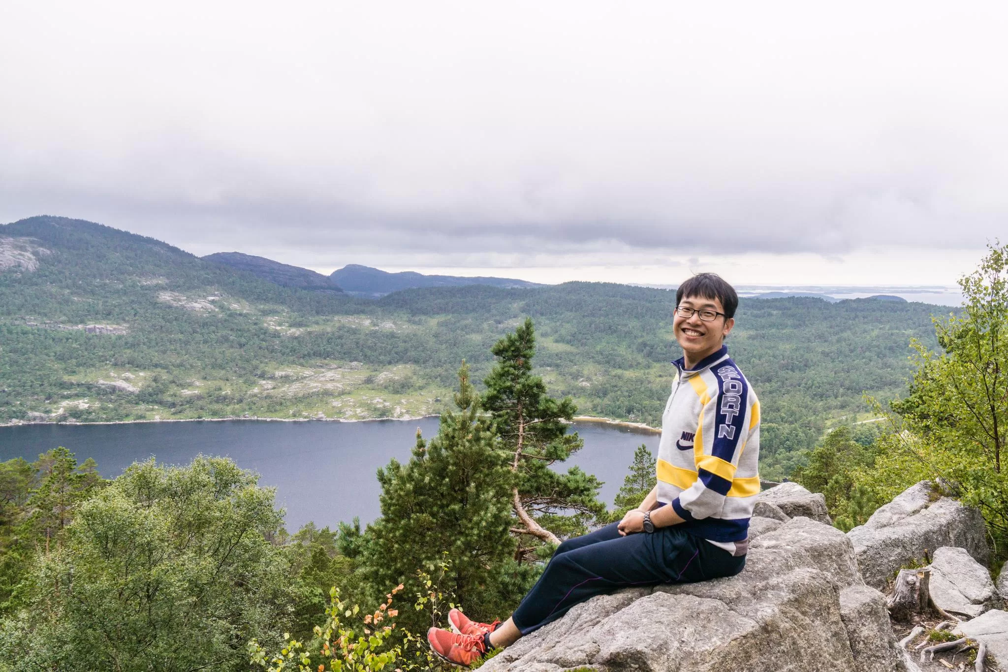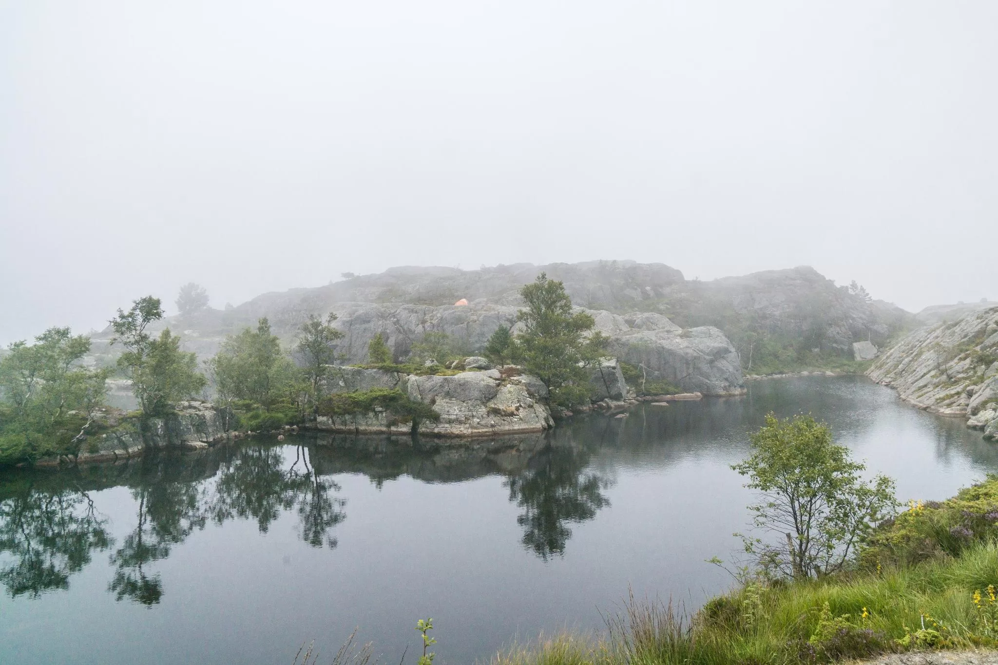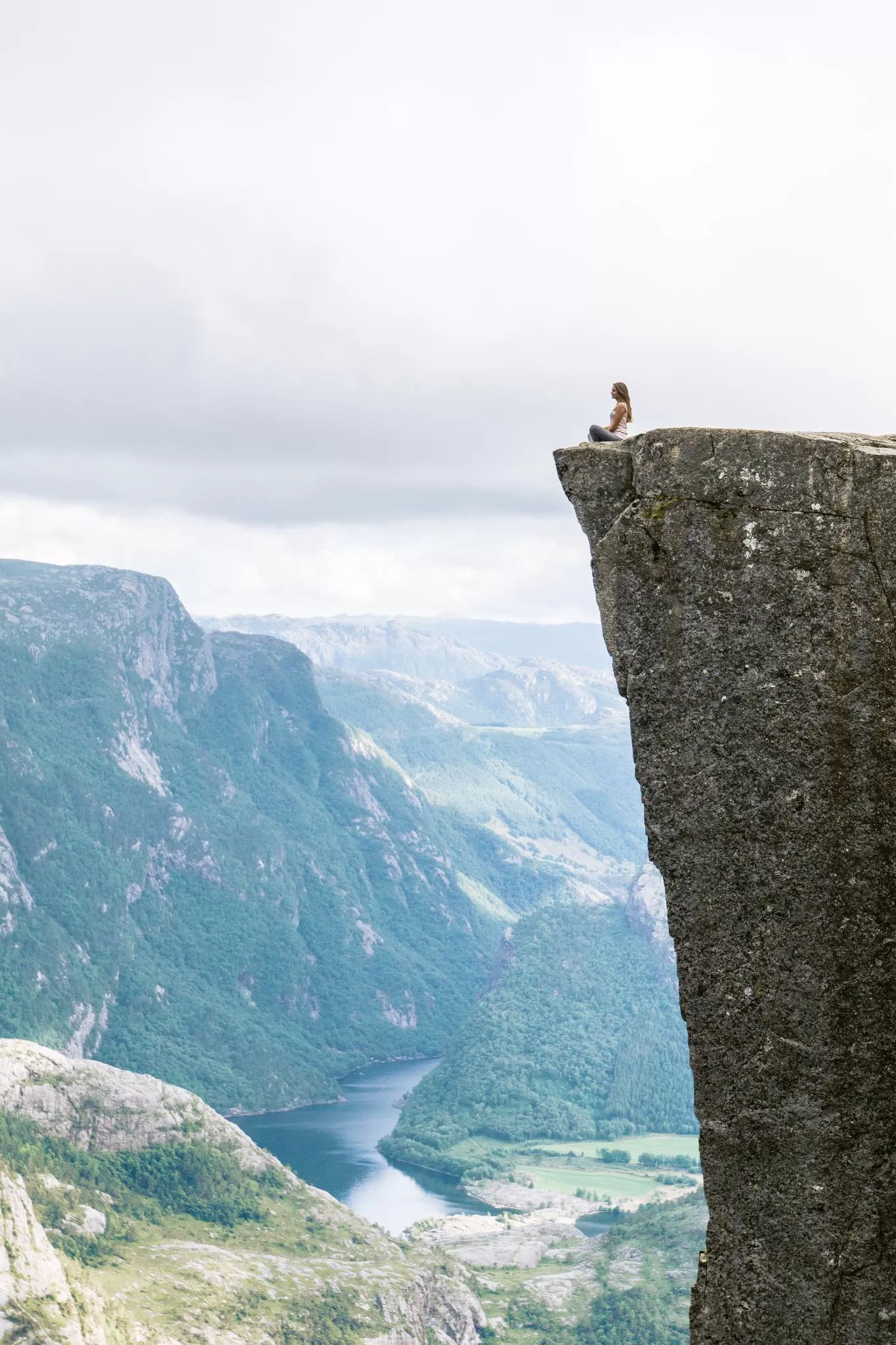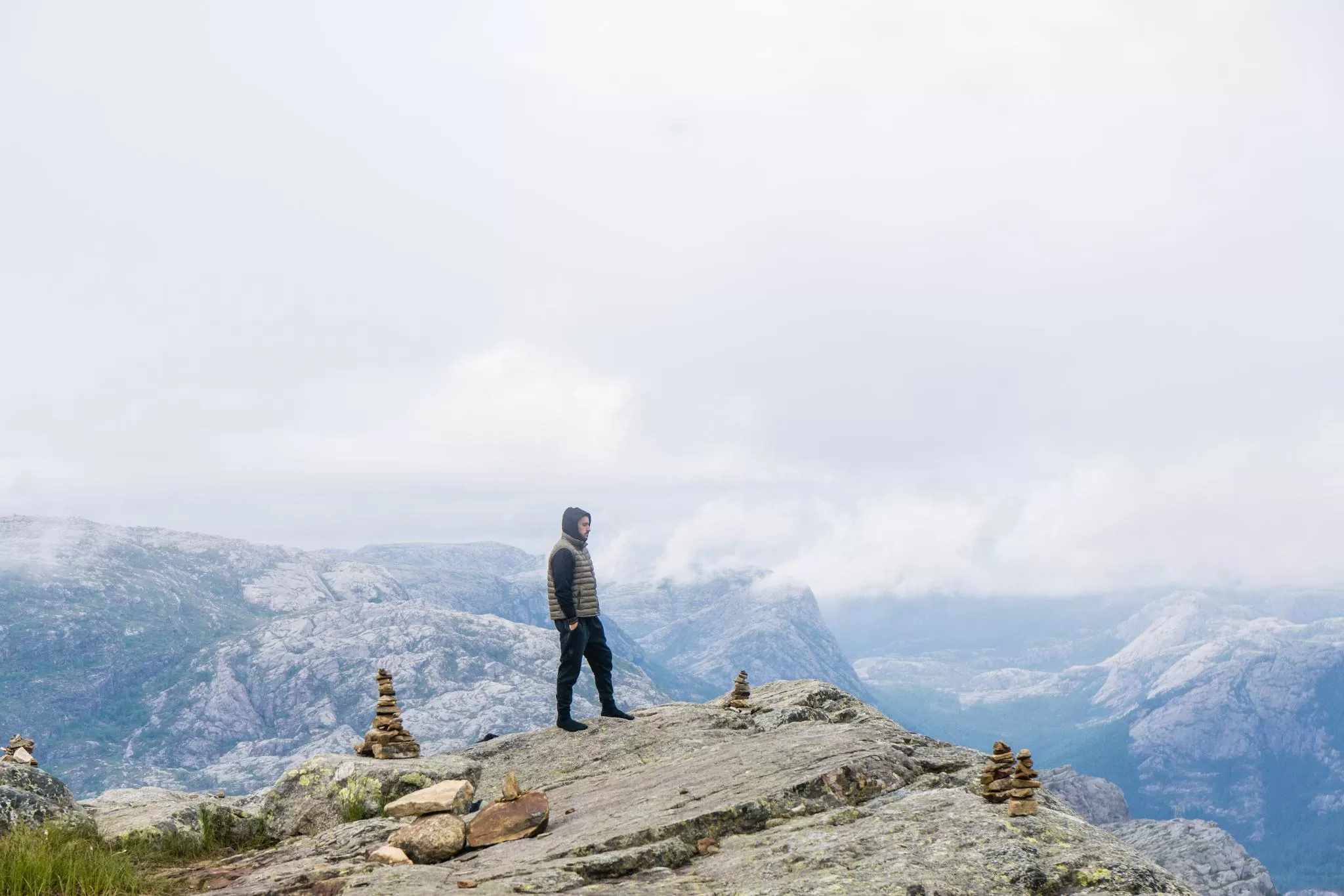 我們到的時候,正值下午時分,此時聖壇岩上起了濃霧,宛如薄紗一般披散在蜿蜒的呂瑟峽灣上,增添了幾分朦朧的美感。雖然無法看清峽灣遼闊的樣貌,卻絲毫不減壯闊峽灣的帶給旅人的震撼。