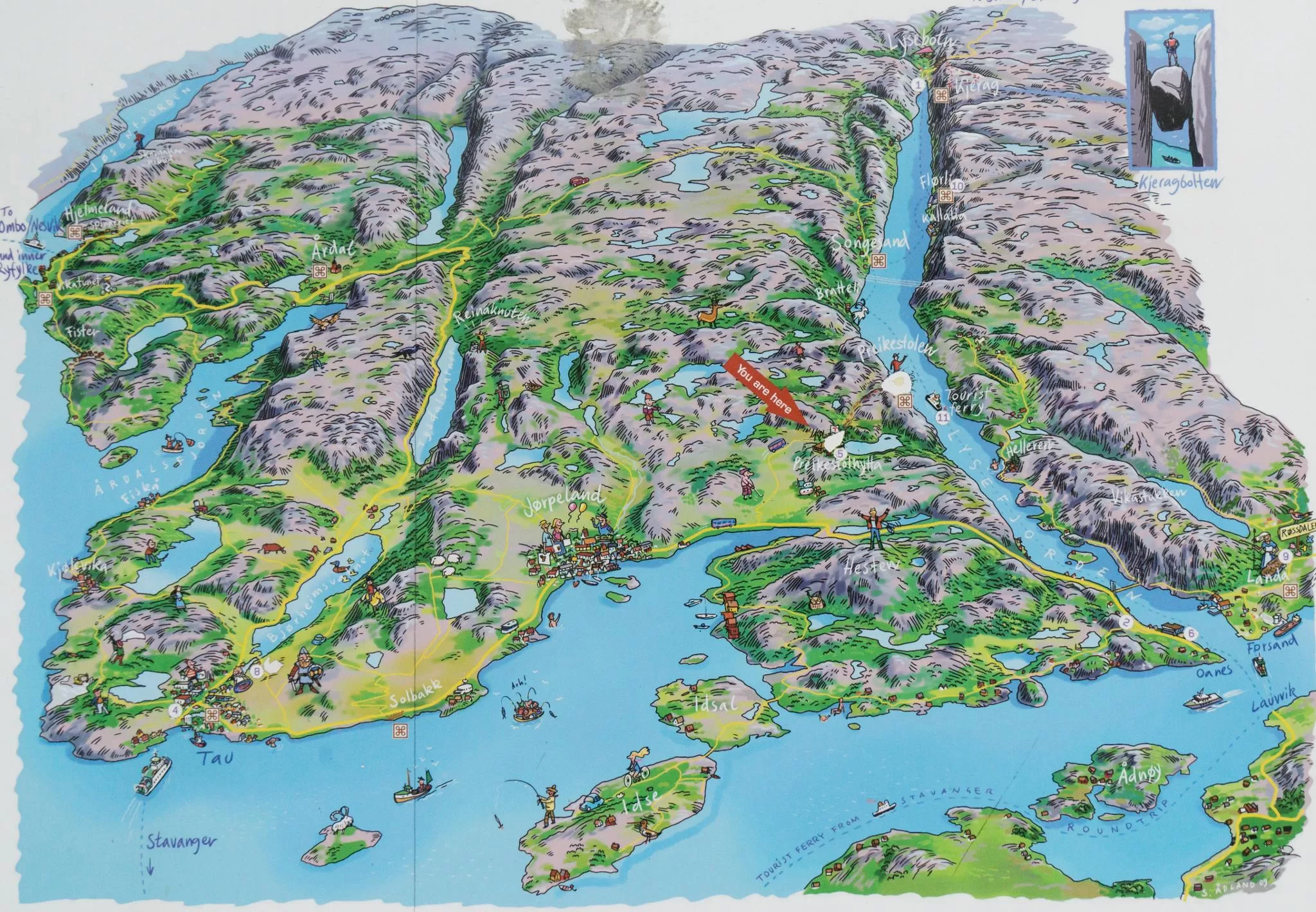 ▲ 位於聖壇岩停車場的地圖看板,是由西往東望去(看板上方是東方)。呂瑟峽灣是圖右邊的狹長水路,聖壇岩位於呂瑟峽灣的西北緣、奇蹟石位於呂瑟峽灣的東南緣。