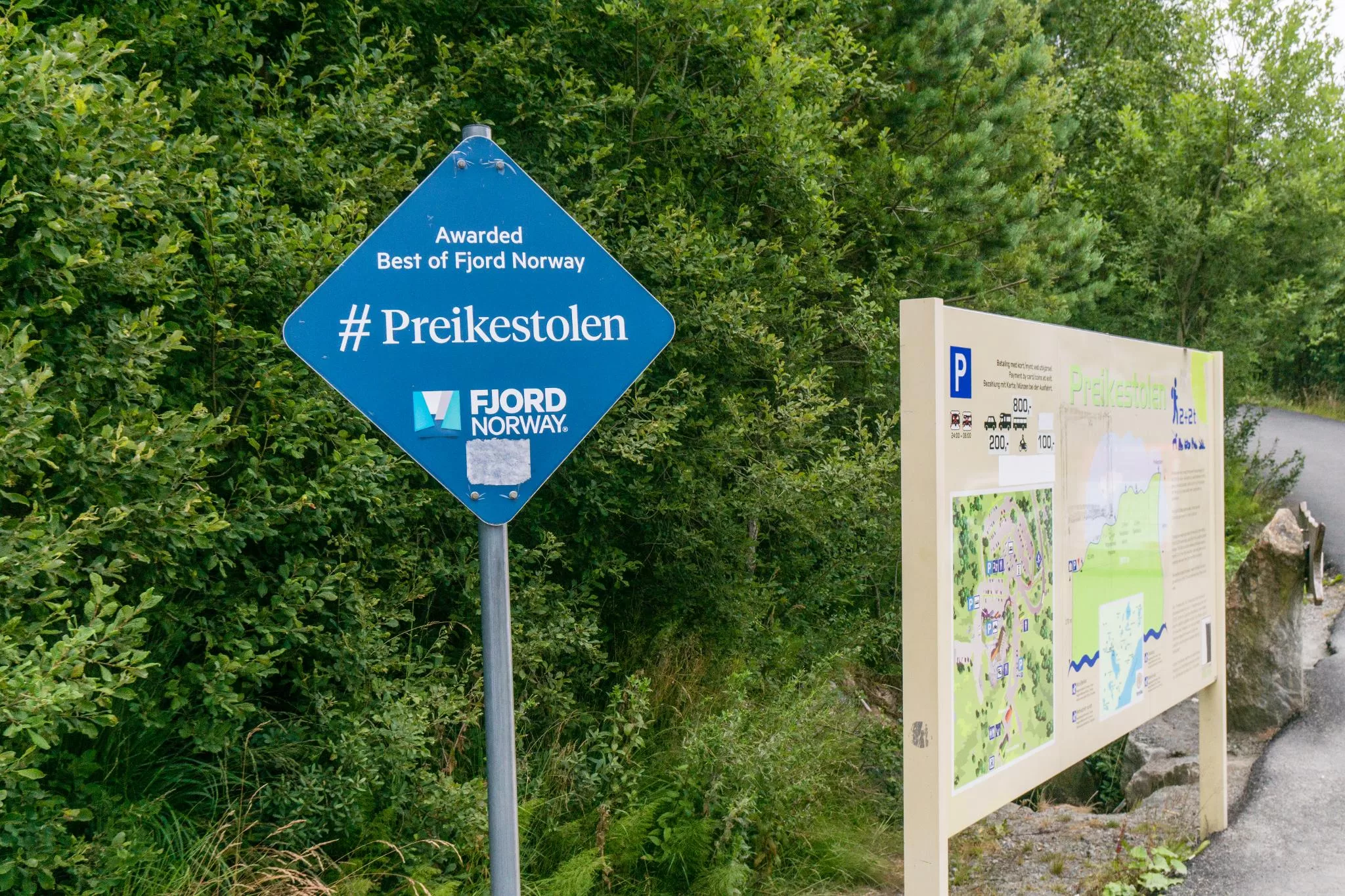 因為老少咸宜,聖壇岩也是三座岩石中最觀光化的一座,在停車場甚至可以看到為數眾多的遊覽車載著團客前來。在Google Map上搜尋“preikestolen parking”,即可定位聖壇岩的停車場。這附近最主要也只有這一座停車場,不像惡魔之舌有三座停車場這樣複雜。聖壇岩的停車費用NOK300一天,比惡魔之舌的便宜,可以信用卡付款,非常方便。