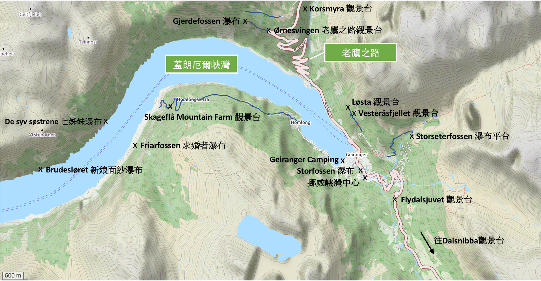 老鷹之路應該可說是所有到訪蓋倫格峽灣的觀光客一定會來的景點。公路呈現「之」字型,短短幾百公尺的海拔落差就有高達12個髮夾彎。公路邊建有觀景台,可以明信片角度俯瞰蓋倫格峽灣與蓋倫格小鎮,非常壯闊。因為世界級景點,這裏的遊客爆棚,不僅觀景台處人潮多、不易停車,整條狹窄的老鷹公路塞滿許多大型遊覽車與通勤巴士,非常壅塞。