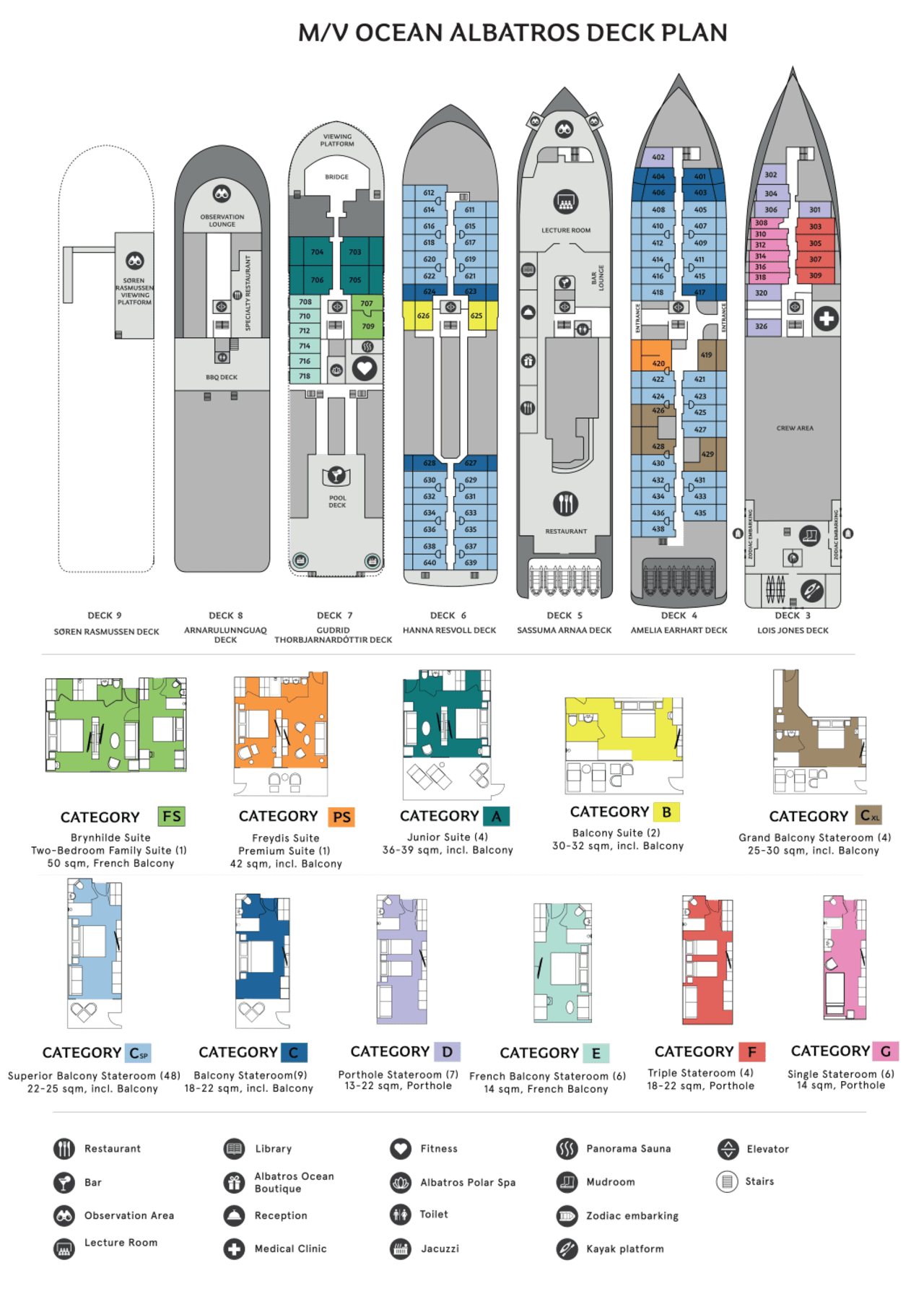 海洋信天翁號另設有全景桑拿房,並提供更多專為單人旅客設計、免單人附加費的專屬艙房選擇。