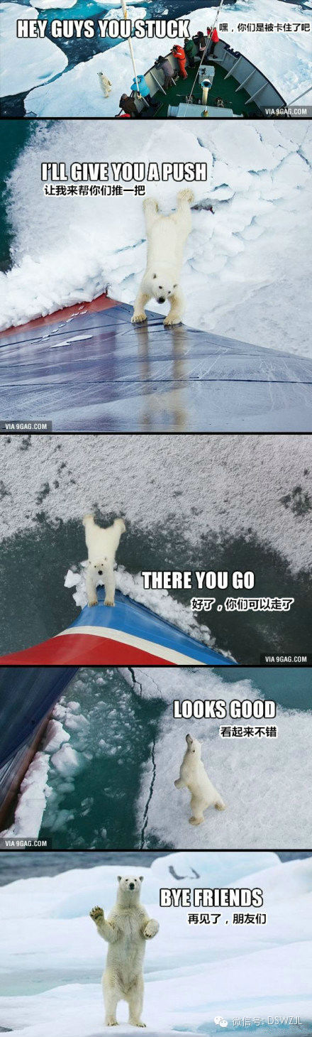 北極的一艘船不慎卡在了浮冰上,路過的北極熊就推了他們一把